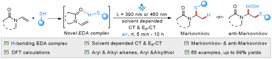 文江伟副教授团队开发了光学活性H-键-S-EDA复合物模型,该EDA复合物模型解决了传统EDA复合物芳基底物的限制,并将其应用在光诱导下羰基活化烯烃的氢硫化和羟硫化。研究发现溶剂化效应是控制H-键-S-EDA复合物经快速电荷转移(CT)还是缓慢能量电荷转移(En-CT)的关键,从而调控位点选择性。