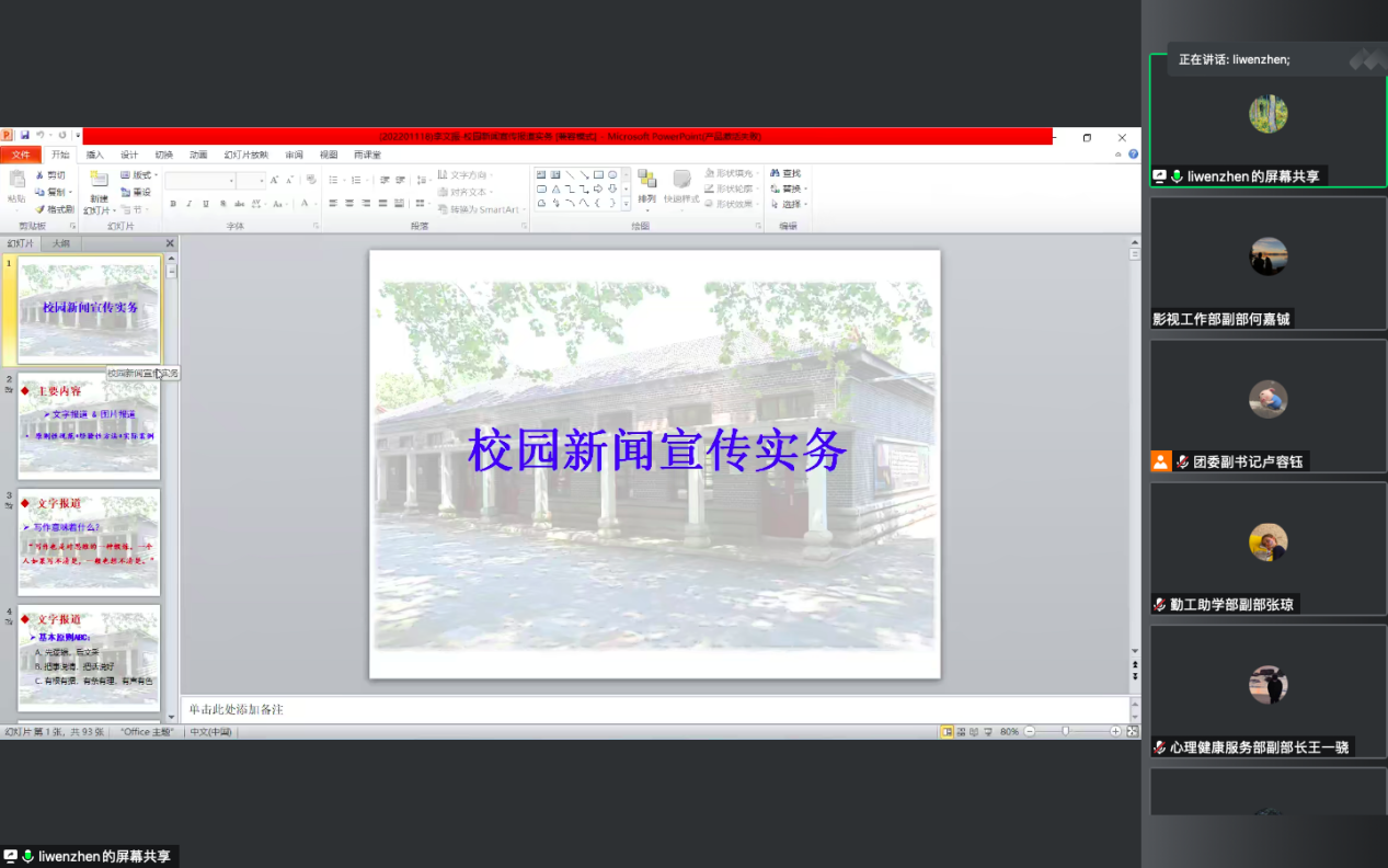 李文振以“校园新闻宣传实务”为题,分别从新闻写作的文字报道和图片报道两方面进行讲解。首先,他带领成员们从新闻定义、主要内容和写作原则三个方面来初步认识新闻写作。随后,李老师在图片报道方面为学员们做出详细指导。最后,李老师向小青马们提出建议,希望大家齐心协力做好校园宣传工作,为学校绽放光彩。至此,“青马工程”第二讲圆满结束。