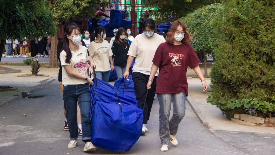2021级全体本科生于西公寓二号楼为新生搬运被褥,为新生的到来做好前期准备工作。