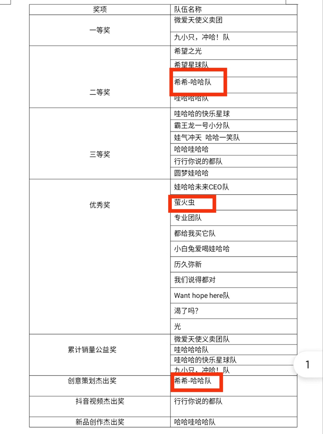 希希-哈哈队获得二等奖以及创意策划杰出奖,萤火虫队获得优秀奖。