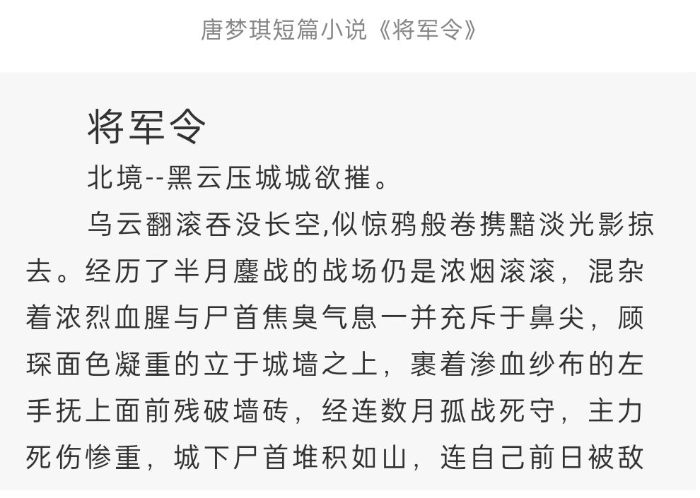 古色古香的校园美景和朝气蓬勃的人文精神。此外唐梦琪的短篇小说《将军令》,讲述蛮夷侵犯、奸臣当道、君臣离心的背景下,面对外敌的侵犯,主人公选择背负悖逆之骂名、功高震主之危险,毅然出兵抗战,以平息烽火狼烟的爱国主义故事。其字里行间满是家国情怀和青春志向,直接响应了此次“青春正能量”的活动宗旨。