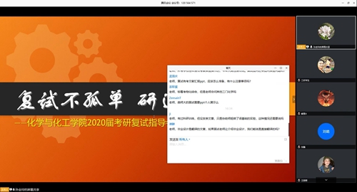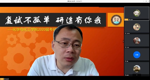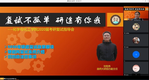 “复试不孤单,研途有你我”——2020届考研复试指导会通过腾讯会议形式线上进行。复试指导会由化院团委书记、2016级辅导员孙金玲主持,特邀研究生招生办公室副主任刘宪伟、动漫之家