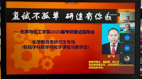 “复试不孤单,研途有你我”——2020届考研复试指导会第二场暨化学教育类专场(包括学科教学与化学课程与教学论)复试指导会通过腾讯会议形式线上进行。复试指导会由化院团委书记2016级辅导员孙金玲主持,特邀教育学博士、副教授、硕士生导师、化学教学论教研室主任、山东省师范院校化学教论研究会秘书长姬广敏作为主讲老师,为2016级准备教育类复试的同学解答疑难困惑。