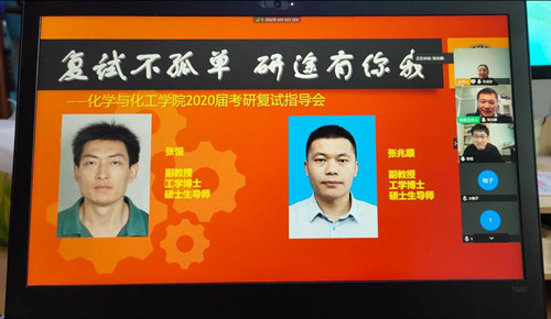 “复试不孤单,研途有你我”——2020届考研复试指导会第三场暨化工与制药类专场(包括化学工程与工艺、制药工程、应用化学、材料化学)复试指导会通过腾讯会议形式线上进行。复试指导会由化院团委书记2016级辅导员孙金玲主持,特邀工学博士、副教授、硕士生导师张恒及张兆顺老师,为2016级准备化工与制药类专业复试的同学解答疑难困惑。