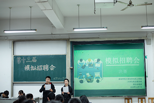 比赛分为初赛和决赛两个阶段,初赛于11月30日在系楼101举行,由王卓、王立涛、李宁、张旭瑞主持,评委为大学生就业服务部部长王旭、信息部部长邵真、科技部部长胡兵、综合治理部部长李炜钰。评委根据简历设计、面试礼仪、语言表达、专业知识、特长等评分标准进行打分,最终选出10名选手进入复赛。决赛于12月7日在综合楼105举行,由王滨和陆鸿亚主持,评委为化工教研室王凤翔老师、王重斌老师,无机化学教研室李梦婷老师。复赛分为简历投递、自我介绍、应聘演说、情景模拟、考官提问五个环节。选手沉稳冷静,灵活应答,表现出对竞选岗位的充足准备。同时以自身经历为切入点,巧妙处理情景问题,充分展示自身优势。评委依据选手表现依次进行点评,肯定选手表现中的优势部分,指出需要进一步完善的地方,并勉励选手保持热情,继续努力。中场穿插“心有灵犀,你比我猜”的小游戏,现场气氛十分活跃。最终根据评委老师打分,比赛决出一等奖一名、二等奖两名、三等奖四名。