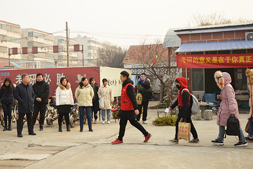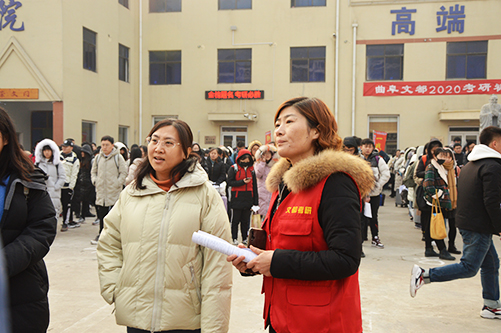 送考研生提前去往考点城市济宁。学院党委副书记毛永正、团委书记孙金玲、辅导员王亚平、冯德浩亲临乘车点,送考研学子出发。