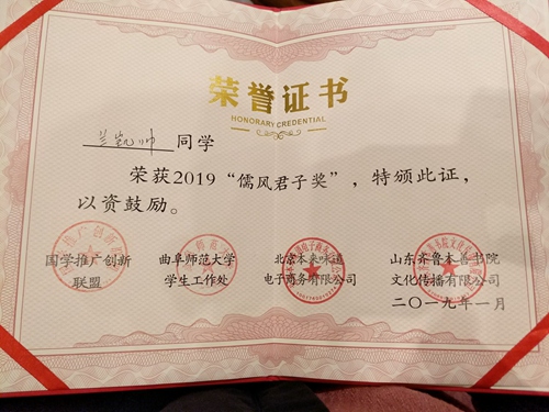 30名优秀学子在曲阜市“本来味道2019跨年盛典”上荣获首届儒风君子奖学金,每人获得奖金2000元。其中动漫之家