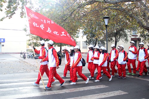 2017级新生在化学院楼前集合,着清一色系服,统一佩戴帽子,井然有序地前往参观三孔——孔庙、孔府、孔林。