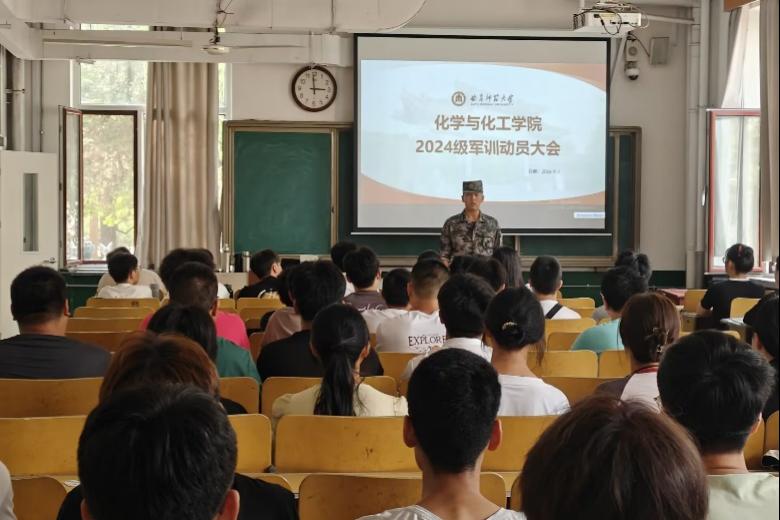 于化学楼召开2024级新生军训动员大会,2024级军训教官及学院2024及全体本科生参加会议。