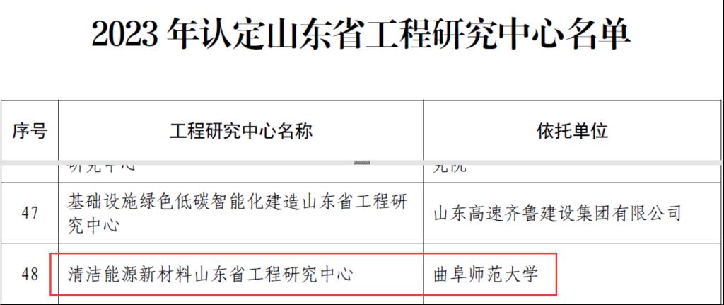 与山东圣阳电源股份有限公司联合申报的“清洁能源新材料山东省工程研究中心”成功入选,这是继山东省“催化转化与清洁能源”高等学校重点实验室立项建设后,学院获批的又一重要研究平台,标志着学院高水平学术研究平台建设取得新进展。