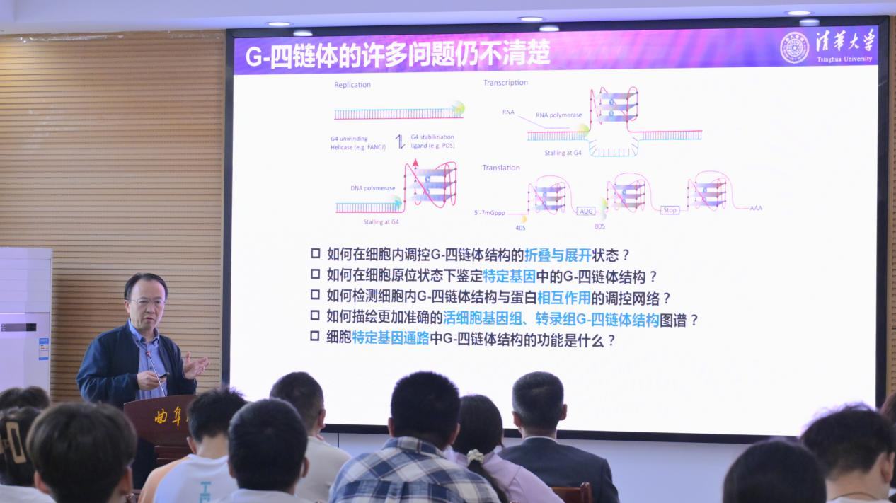 本次学术报告中,李院士提出细胞基因通路中G-四链体的生物分析是揭示疾病机制、发现治疗靶点的关键,发展高灵敏、高选择性、高通量的G-四链体分析方法对揭示其功能至关重要。李院士重点介绍了其团队在该领域的多项创新成果,首次实现单个基因RNA G4特异性成像分析,建立了活细胞内特定单个基因RNA G4结合蛋白的原位标记与组学筛查新方法,发展了活细胞原位标记染色质G4结构的高通量测序技术,探究了G4结构在肿瘤、DNA损伤、病毒等基因通路的新现象,构建了新的G4解旋剂、G4通路新药物筛选。这些研究为在分子层面理解肿瘤、病毒感染等疾病机制提供了原创技术平台和新视角,为靶向G-四链体的疾病诊断与药物开发奠定了重要基础。