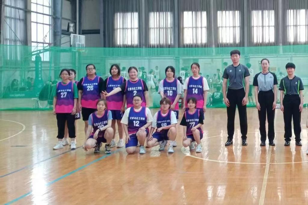 图为赛前化院女篮与裁判员合照