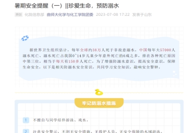 此次活动围绕提高学生暑假安全防范意识为目的而展开,通过班级群提醒、公众号推文等形式,全面开展防溺水、防诈骗、防邪教、防食物中毒、防交通事故、防极端天气等内容的安全教育,教育学生不去陌生水域游泳,不随意刷单或扫码,不参与邪教组织,不吃生冷变质食物,外出遵守交通规则,骑电动车要戴头盔,极端天气不外出,男生不酗酒、不打架等等,不断提升学生暑假安全防范意识,自觉远离各种危险。通过暑假安全教育知识宣传,以及安全注意事项提醒,增强了同学们的安全防范意识,为安全快乐地度过暑假提供了有力的保障。