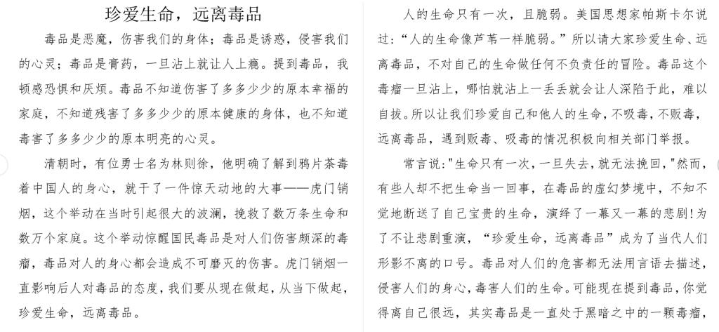 本次活动以毒品预防教育为主题,通过征集以“远离毒品,向阳而生”为主题的征文,以增强学生识毒防毒拒毒意识,号召身边大学生深入学习毒品的危害,提高学生的警惕,远离毒品。大家踊跃积极参赛,充分展现了同学们对于毒品预防教育的重视,提高了自身的警惕性和防范力。