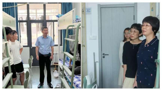 图为领导老师走访宿舍照片