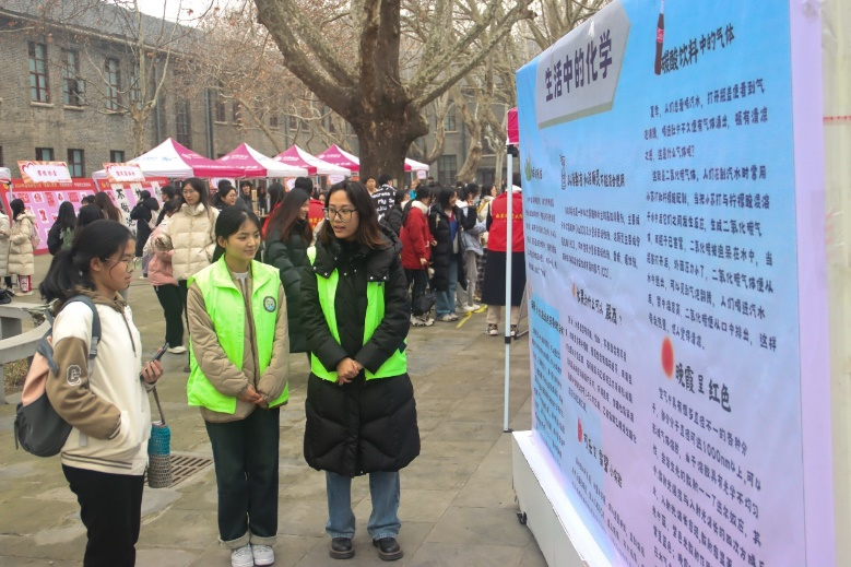 设置了“生活中的化学”、“诗词中的化学”两块展板,并设有专门的讲解志愿者现场进行讲解。活动中,讲解人员用生动的语言讲解日常生活中存在有关化学知识的例子,揭示生活中的化学奥秘。场内气氛活跃,同学们热情回应。
