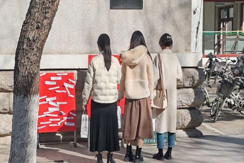 图为三名女生在留言展板进行观看