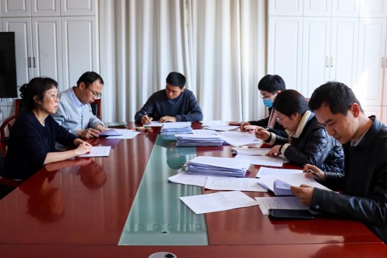 图为评委老师评审材料现场