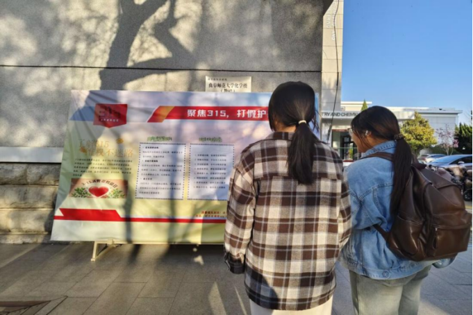 此次展板宣传活动的内容包括3·15消费者权益日的由来、维权方法以及典型案例等,吸引了众多学生观看,学生结合自身经历提出问题,同时权益部成员为其解答疑惑。