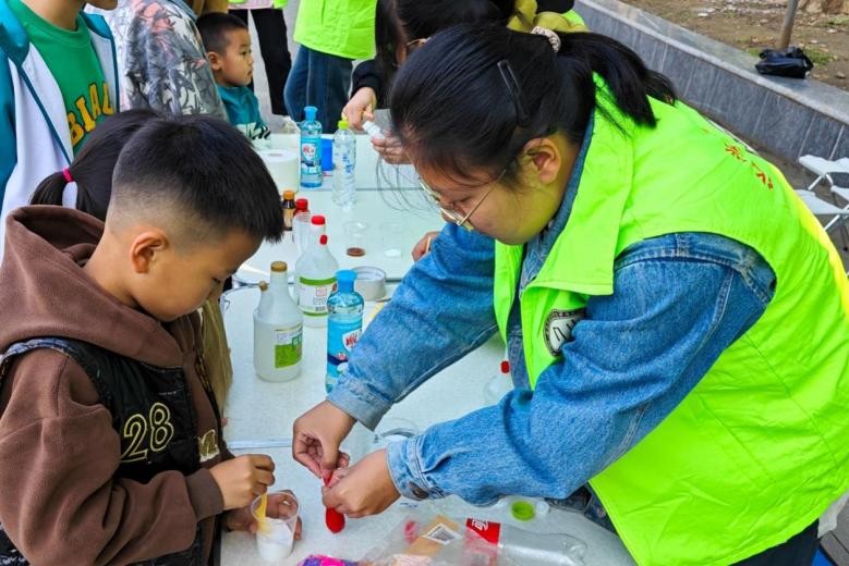 奇妙的实验活动让孩子们兴奋不已,志愿者们耐心引导小朋友体验实验过程,并细致讲解背后的科学原理。“火山爆发”与“气球长大了”实验中,白醋与小苏打发生奇妙反应,趣味十足;维生素C与碘的氧化还原反应,幻化出“神奇变色”的效果;“彩虹泡泡龙”实验更是瞬间点燃了孩子们的热情。志愿者还通过科普展板,将生活中的化学小知识生动呈现,让复杂原理变得通俗易懂。最后,活动在孩子们的欢声笑语中画上了圆满的句号。