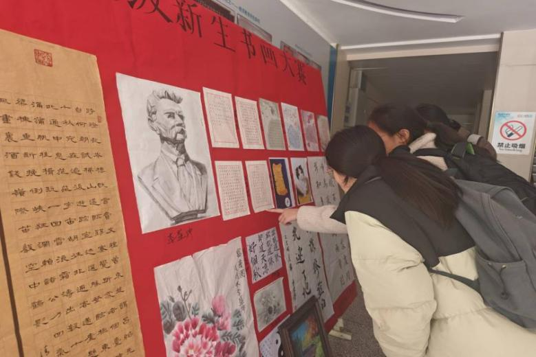 新生利用课余时间创作,以对美学的热爱投入创作,将自身对美学的理解融入作品,经评选,部分优秀作品在学院内进行展出。作品展出后,同学们纷纷走向展板,认真浏览每一幅作品,现场氛围热闹有序。